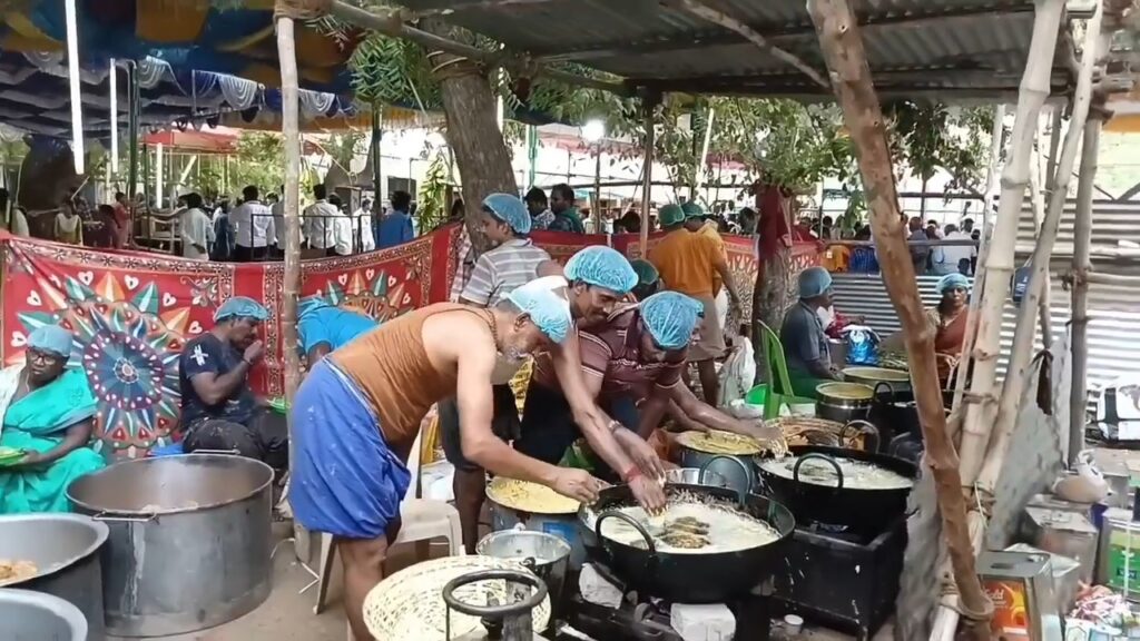 இரவு மாப்பிள்ளை விருந்தில் கேசரி வெண் பொங்கல் சாம்பார் வடை என 50 ஆயிரம் பேருக்கு வழங்கப்பட்டது.