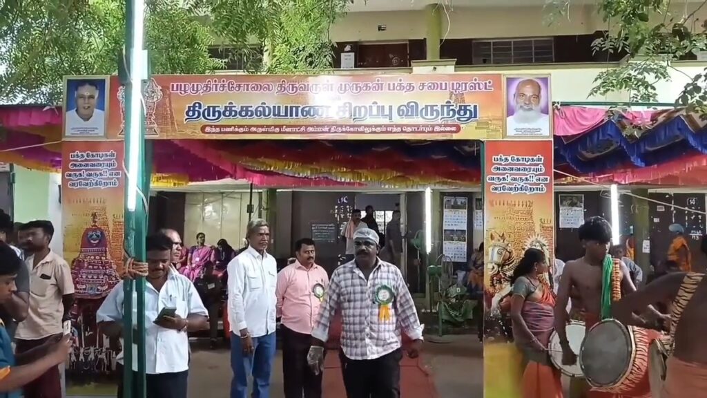 மதுரை மீனாட்சி சுந்தரேஸ்வரர் திருக்கல்யாண விருந்து நிகழ்ச்சிக்கு பழமுதிர்ச்சோலை திருவருள் முருக பக்தர்கள் சபை செயலாளர் வெங்கடேசன் மற்றும் நிர்வாகிகள ஏற்பாடு செய்திருந்தனர்.
