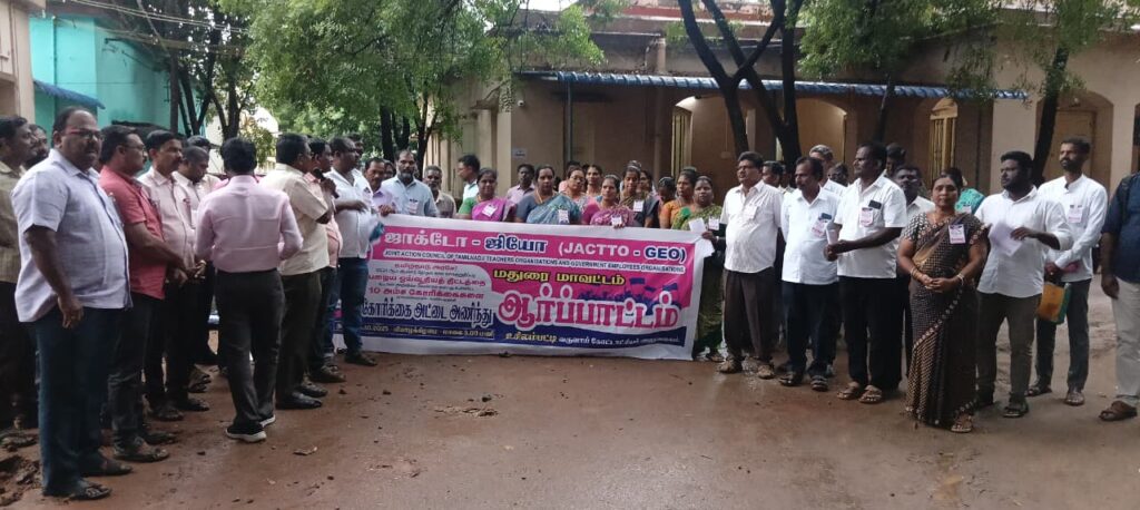 இதன் ஒரு பகுதியாக மதுரை மாவட்டம் உசிலம்பட்டி வருவாய் கோட்டாச்சியர் அலுவலகம் முன்பு தேர்தல் வாக்குறுதியான பழைய பென்சன் திட்டத்தை அமல் படுத்த வேண்டும் உள்ளிட்ட 10 அம்ச கோரிக்கைகளை வலியுறுத்தி கோரிக்கை அட்டை அணிந்து, தமிழ்நாடு ஆரம்பப்பள்ளி ஆசிரியர் கூட்டணியின் மாநில பொதுச் செயலாளர் முருகன் மற்றும் ஜாக்டோ ஜூயோ மாவட்ட நிர்வாகிகள் தலைமையில் ஜாக்டோ ஜூயோ அமைப்பினர் கண்டன ஆர்ப்பாட்டத்தில் ஈடுபட்டனர்.,