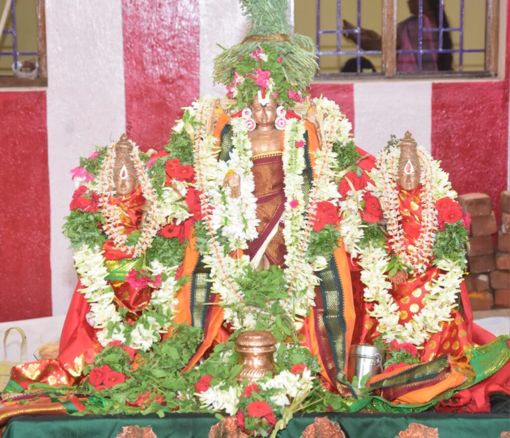 இதற்கான பணிகள்பணிகள் கடந்த சில நாட்களாக புணரமைப்பு செய்யப்பட்டது. தொடர்ந்து நேற்று காலை திருக்கோஷ்டியூர் ஸ்ரீ லட்சுமி நரசிம்ம அய்யங்கார் தலைமையில் மங்கள இசை உடன் விஷ்வக்சேனர் முதலாம் காலயாக பூஜை நிகழ்ச்சிகள் தொடங்கின. தொடர்ந்து புண்யாவாகனம், வாஸ்து சாந்தி ஹோமம், அங்குரார்பணம், நடைபெற்றது. விமான கலசம் பிரதீஷ்டை நடைபெற்று தீபாராதனை காட்டப்பட்டு பக்தர்களுக்கு பிரசாதம் வழங்கப்பட்டது.