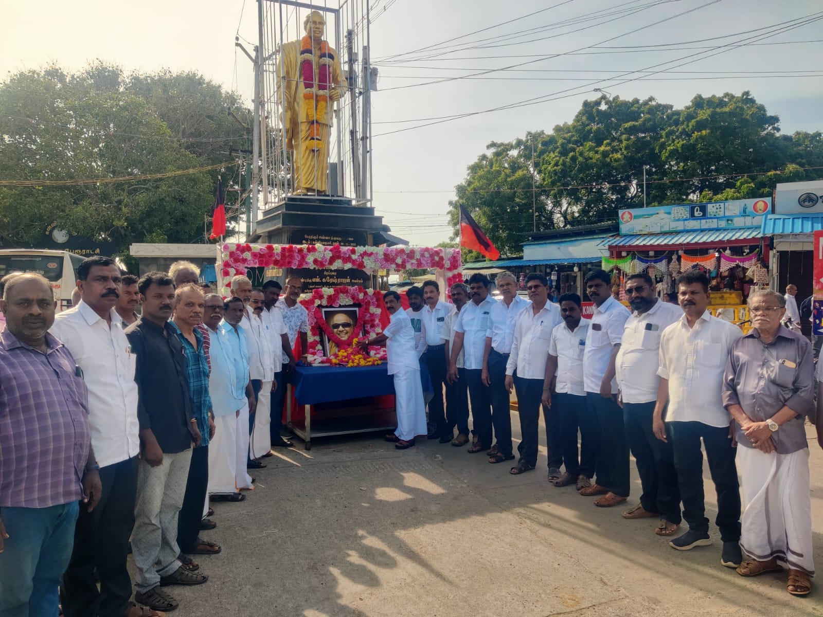 திமுக தலைவரும் மறைந்த தமிழக முன்னாள் முதலமைச்சரான கருணாநிதி அவர்களின் ஏழாம் ஆண்டு நினைவு நாளான இன்று கன்னியாகுமரி அண்ணா சிலை முன்பு அலங்கரித்து வைக்கப்பட்டுள்ள கலைஞரின் உருவப்படத்துக்கு கன்னியாகுமரி நகர திமுக சார்பில் மாலை அணிவித்து மலர் அஞ்சலி செலுத்தப்பட்டது.