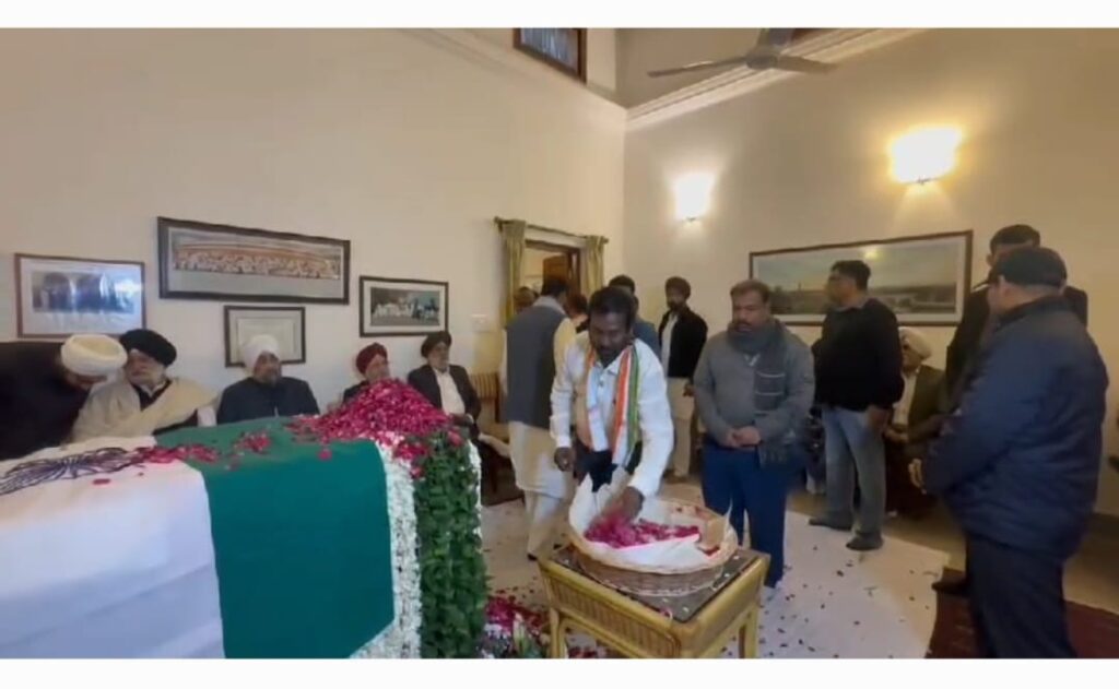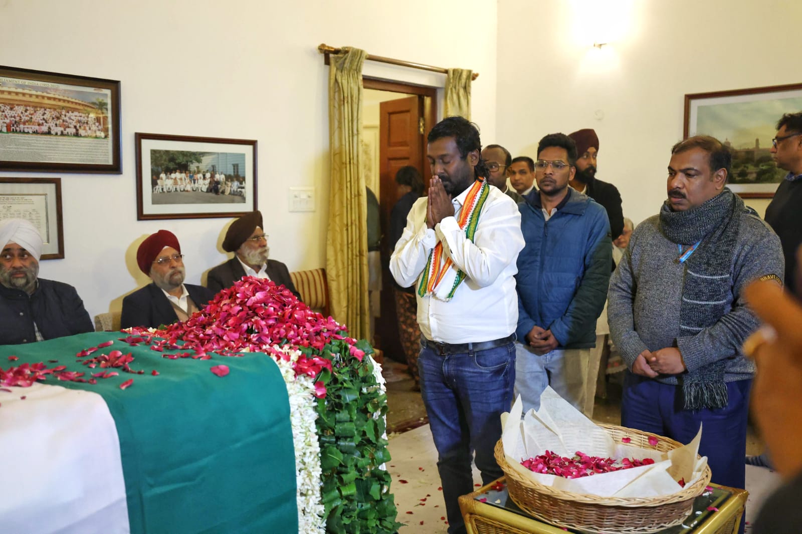 இந்தியாவின் முன்னாள் பிரதமர் மன்மோகன் சிங் உடலுக்கு டெல்லியில் உள்ள அவரது வீட்டில் மக்களவை காங்கிரஸ் பொருளாளரும், கன்னியாகுமரி நாடாளுமன்ற உறுப்பினருமான விஜய் வசந்த் மலர் தூவி அஞ்சலி செலுத்தினார்.