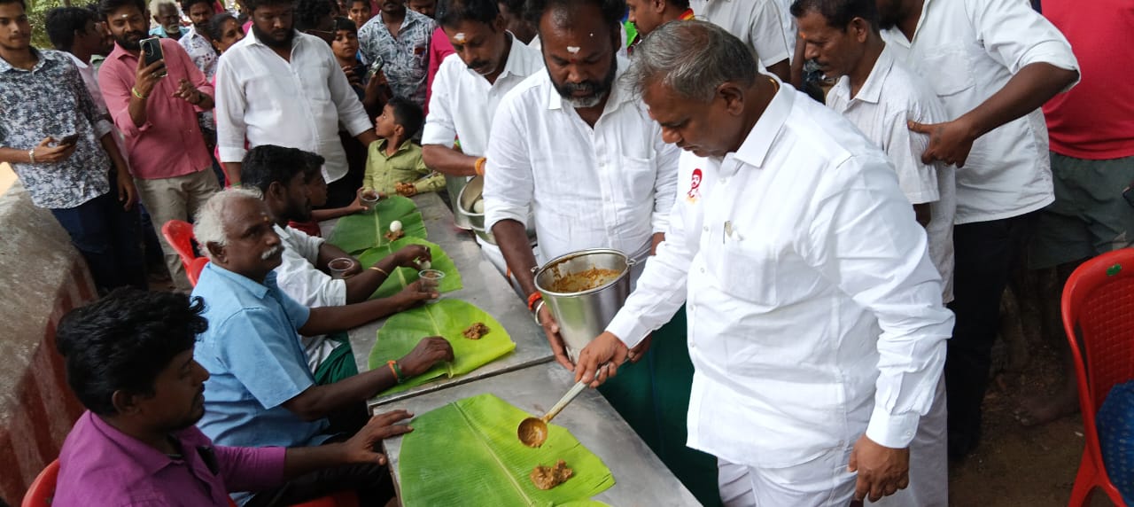 வலையங்குளம் கருப்பசாமி கோவிலில் நடைபெற்ற கிடா விருந்தினை தமிழக வெற்றிக் கழக மாநில பொதுச்செயலாளர் புஸ்சி ஆனந்த் துவக்கி வைத்தார்.