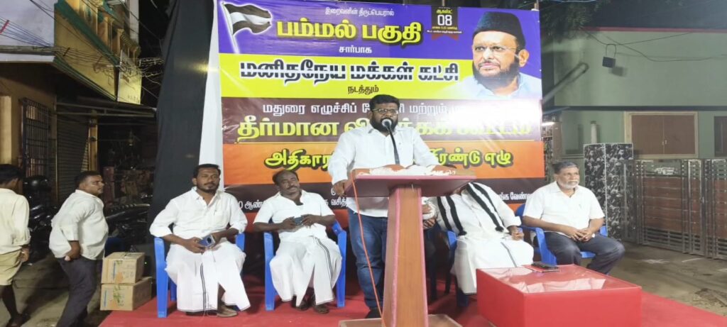 மதுரையில் நடைபெற்ற மனித நேய மக்கள் கட்சியின் மதுரை எழுச்சி பேரணி மற்றும் மாநாட்டின் தீர்மானங்களை விளக்கும் வகையில் தெருமுனை கூட்டங்கள் 1000 இடங்களில் நடத்து வேண்டும் என அக்கட்சியின் தலைவர் எம்.எச்.ஜவாஹிருல்லா அவர்களின் ஆணைகிணங்க மாநிலத் துணைப் பொதுச் செயலாளர் தாம்பரம் எம்.யாக்கூப் அவர்களின் அறிவுறுத்தலின்படி, மாவட்டச் தலைவர் எஸ்.கே ஜாஹிர் உசேன் அவர்களின் ஆலோசனையின்படி செங்கல்பட்டு வடக்கு மாவட்டம் பம்மல் பகுதி 10 வது வார்டில் மாவட்ட துணைச் செயலாளர் சவுக்கத் அலி தலைமையில் பகுதி தலைவர் சாதிக் பாஷா வரவேற்புரையில் நடைபெற்றது,