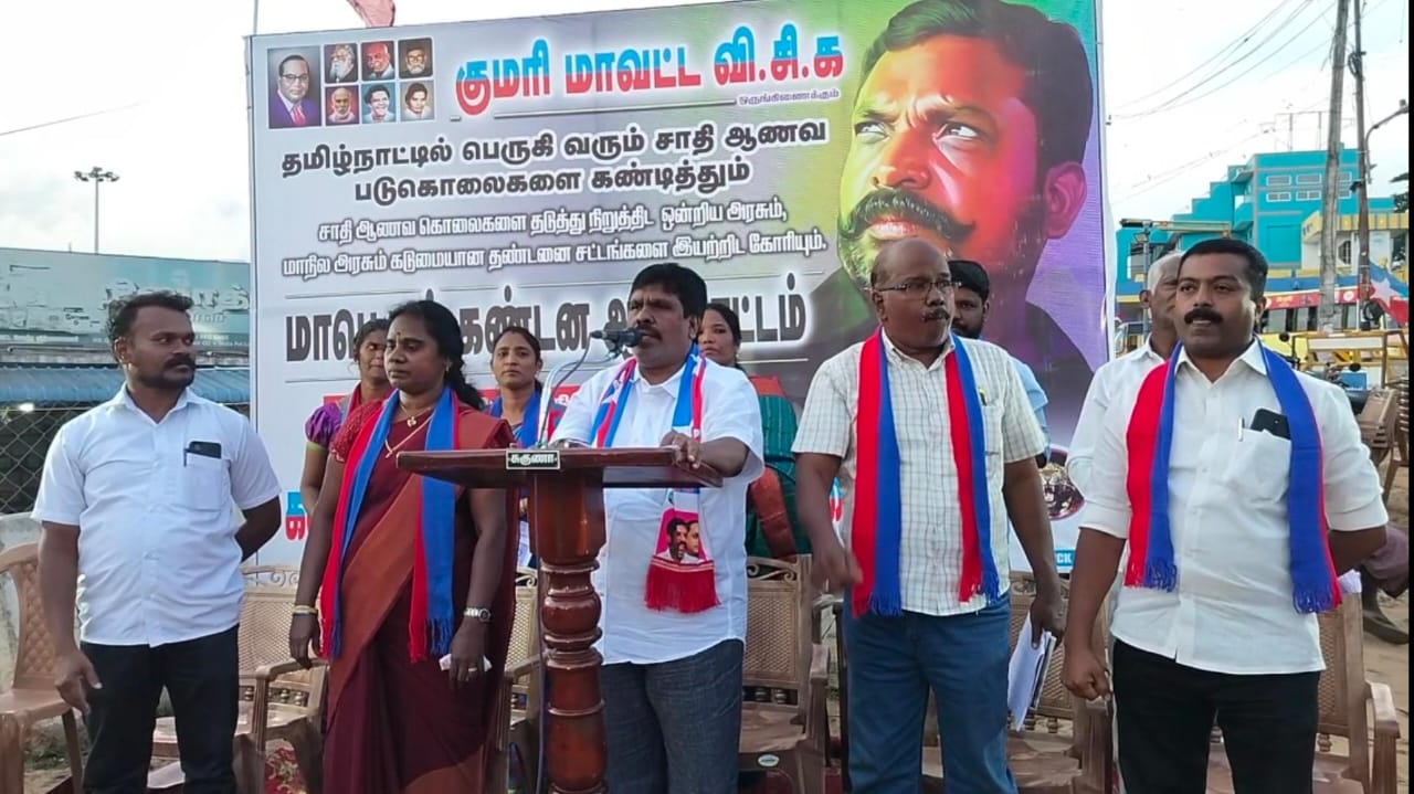 தமிழக முதல்வராக ஸ்டாலின் பதவிக்கு வந்த கடந்த 4 ஆண்டுகளில் தமிழகத்தில் 30க்கும் மேற்பட்ட ஆணவப் படுகொலைகள் மற்றும் 3500 தலித்துக்கள் படுகொலை நடந்தது. ஆணவப்படு கொலையை தடுத்து நிறுத்த கோரி கன்னியாகுமரி மாவட்டம் நாகர்கோவில் வடசேரியில் விடுதலை சிறுத்தைகள் கட்சி ஆர்ப்பாட்டம் நடத்தி வருகின்றனர்.