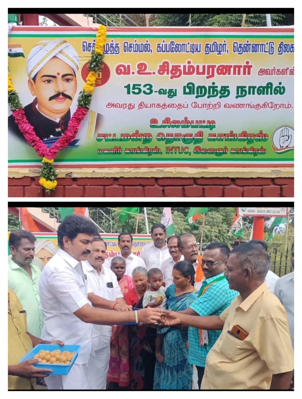 இதன் ஒரு பகுதியாக மதுரை மாவட்டம் உசிலம்பட்டி தேவர் சிலை முன்பு காங்கிரஸ் கட்சியின் சார்பில் விடுதலைப் போராட்ட வீரரும் கப்பலோட்டிய தமிழருமான வ.உ. சிதம்பரனாரின் 153 வது பிறந்த நாளை முன்னிட்டு மாநில பொதுக்குழு உறுப்பினர்கள் சரவணகுமார் மற்றும் மகேந்திரன் தலைமையில் கட்சி நிர்வாகிகள் வ.உ.சி யின் திருவுருவ படத்திற்கு மாலை அணிவித்து மரியாதை செலுத்தி அய்யா வ.உ.சி யின் புகழ் ஓங்குக என முழக்கமிட்டனர் .
