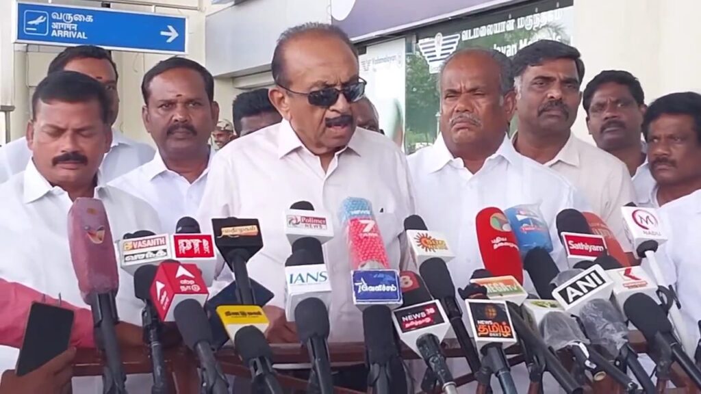 சென்னையில் இருந்து விமானம் மூலம் மதுரை வந்தடைந்த மதிமுக பொதுச்செயலாளர் வைகோ மதுரை விமான நிலையத்தில் செய்தியாளர் சந்திப்பு