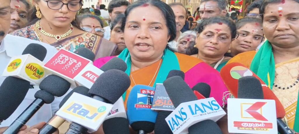 இந்நிலையில் கடந்த மூன்று நாட்களாக பொள்ளாச்சி , உடுமலை வழியாக நடந்து வந்த பாரதிய ஜனதா கட்சியின் தேசிய மகளிர் அணி தலைவி வானதி சீனிவாசன் இன்று மாலை பழனி வந்தடைந்தார். தொடர்ந்து பழனி சண்முக நதியில் புனித தீர்த்தம் தெளித்துக் கொண்டு, தைப்பூசத் திருவிழா நடைபெறும் பழனி பெரியநாயகி அம்மன் திருக்கோவிலில் சாமி தரிசனம் செய்தார். தொடர்ந்து பழனி மலை கோவிலுக்கு சென்ற வானதி சீனிவாசன் அருள்மிகு தண்டாயுதபாணி சுவாமியை தரிசனம் செய்தார். பாதயாத்திரையாக பழனி வந்த சீனிவாசனுக்கு திண்டுக்கல் மேற்கு மாவட்ட பாரதிய ஜனதா கட்சியின் சார்பில் வரவேற்பு அளிக்கப்பட்டது. மாவட்ட தலைவர் ஜெயராமன், மாநில செயற்குழு உறுப்பினரும், முன்னாள் மாவட்ட தலைவருமான கனகராஜ் மற்றும் மகளிரணியினர் உள்ளிட்ட பலர் பங்கேற்று வரவேற்பு அளித்தனர். அப்போது அவர் தெரிவித்ததாவது :-