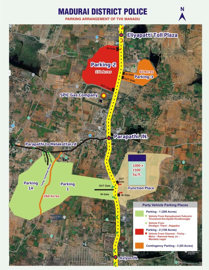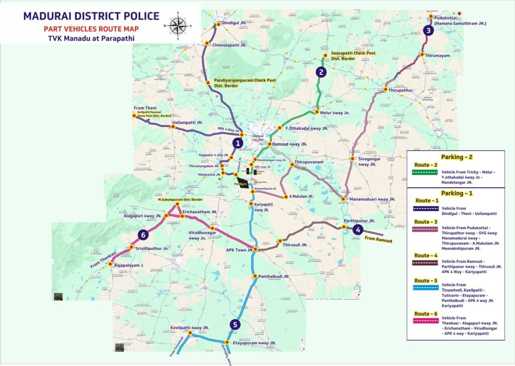 மதுரை மாவட்ட காவல்துறை சார்பில் தமிழக வெற்றி கழக மாநாட்டிற்காக வாகனம் நிறுத்துமிடங்கள் மற்றும் நுழைவாயில் வழிகளை 6 (ஆறு வண்ணங்களில்) தமிழகத்தின் பல்வேறு பகுதிகளில் இருந்து மாறும் வாகனங்களை நிறுத்த காணொளி மூலம் வெளியீடு செய்துள்ளனர்.
