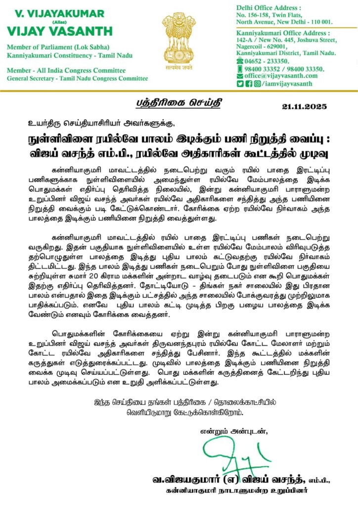 கன்னியாகுமரி மாவட்டத்தில் நடைபெற்று வரும் ரயில் பாதை இரட்டிப்பு பணிகளுக்காக நுள்ளிவிளையில் அமைந்துள்ள ரயில்வே மேம்பாலத்தை இடிக்க பொதுமக்கள் எதிர்ப்பு தெரிவித்த நிலையில், இன்று கன்னியாகுமரி பாராளுமன்ற உறுப்பினர் விஜய் வசந்த் அவர்கள் ரயில்வே அதிகாரிகளை சந்தித்து அந்த பணியினை நிறுத்தி வைக்கும் படி கேட்டுக்கொண்டார். கோரிக்கை ஏற்ற ரயில்வே நிர்வாகம் அந்த பாலத்தை இடிக்கும் பணியினை நிறுத்தி வைத்துள்ளது.