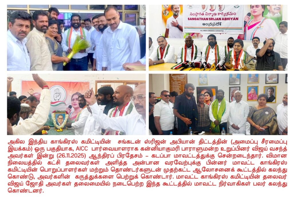 அகில இந்திய காங்கிரஸ் கமிட்டியின் சங்கடன் ஸ்ரிஜன் அபியான் திட்டத்தின் (அமைப்பு சீரமைப்பு இயக்கம்) ஒரு பகுதியாக, AICC பார்வையாளராக கன்னியாகுமரி பாராளுமன்ற உறுப்பினர் விஜய் வசந்த் ஆந்திரப் பிரதேசம் – கடப்பா மாவட்டத்துக்கு சென்றடைந்தார்.