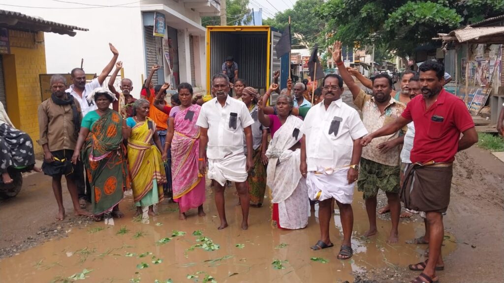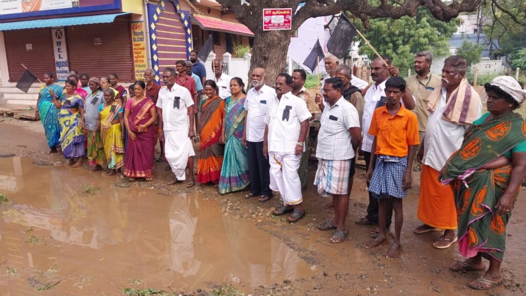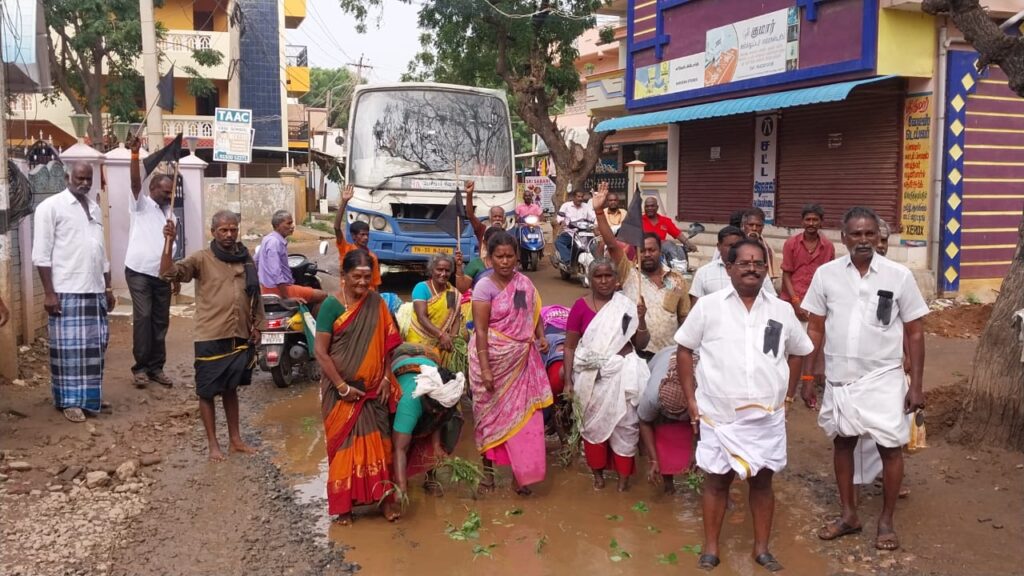 இதுக்குறித்து சம்பந்தப்பட்ட நெடுஞ்சாலைத்துறை அதிகாரியிடம் பலமுறை புகார் செய்தும் எந்த ஒரு நடவடிக்கையும் எடுக்காததால் இன்று காலை பெருங்குடி கிராமத்தில் உள்ள 30க்கு மேற்பட்ட கிராம மக்கள் விநோதமான குண்டும் குழியுமான சாலையில் நாற்று நடும் போராட்டத்தில் ஈடுபட்டனர்.