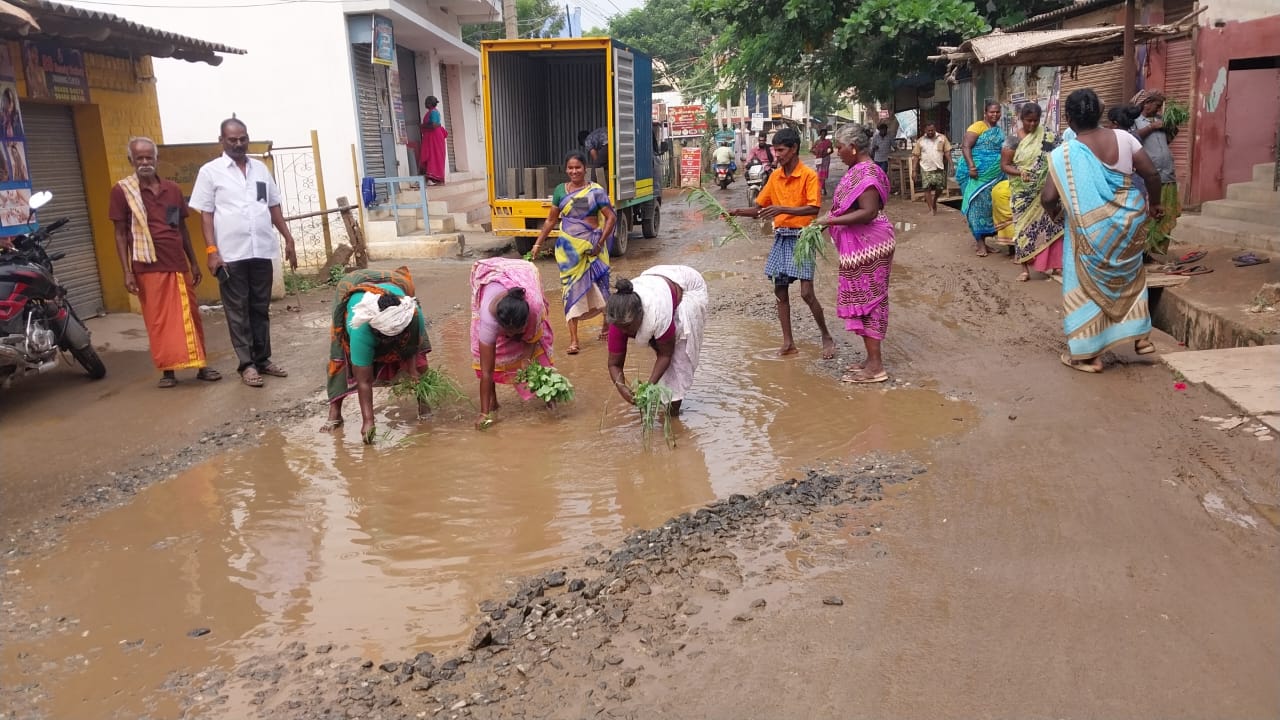 மதுரை பெருங்குடியில் குண்டும் குழியுமான சாலையை சீரமைத்து தரக்கோரி சாலையில் நாற்று நடும் போராட்டத்தில் பெருங்குடி கிராம மக்கள் ஈடுபட்டனர்.