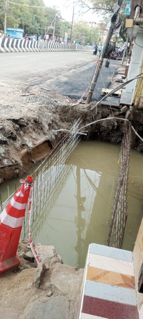 இதனை கண்ட தொழிலாளர்கள் கட்டிட உரிமையாளரிடம் சென்று சொன்ன போது கழிவு நீர் வரத்தான் செய்யும் என்று கூறியுள்ளார், இதனால் தொழிலாளர்கள் வேலை செய்ய முடியாது என்று வேலையை விட்டு பாதியிலேயே சென்று விட்டார்கள். இதனால் தோண்டிய பள்ளம் மூட படாத நிலையில்,பாலம் கட்டும் பணியும் நின்று விட்டது. தற்போது அந்த பள்ளம் கழிவு நீர் குளம் போல காட்சி அளித்து வருகிறது.