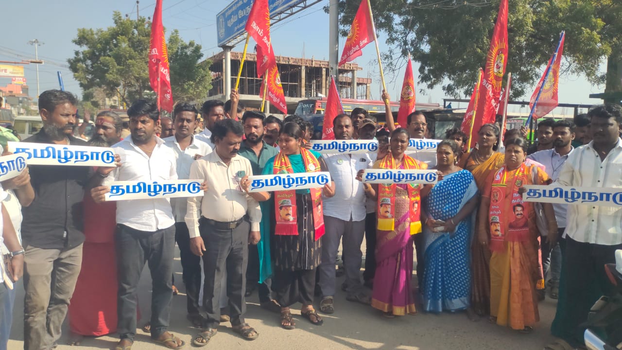 எங்கள் நாடு எங்கள் நாடு தமிழ்நாடு எங்கள் நாடு உள்ளிட்ட கோஷங்களை எழுப்பி மறியல் போராட்டத்தில் ஈடுபட்டனர் அவர்களை தற்போது காவல்துறையினர் கைது செய்துள்ளனர் இதனால் புதுக்கோட்டை புதிய பேருந்து நிலையத்தில் பரபரப்பான சூழ்நிலை நிலவியது.