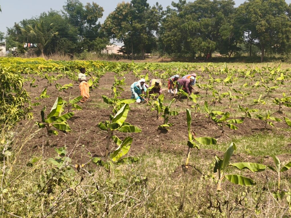 அவ்வப்போது பெய்து வரும் சாரல் மழையினால் தோட்டத்தில் அதிகளவு களை வளர்ந்துள்ளது.இந் நிலையில் வாழை மரத்தின் அடிப்பகுதியில் உள்ள களைகள் அப்புறப்படுத்தும் பணியில் விவசாயிகள் தீவிரமாக ஈடுபட்டுள்ளனர்.