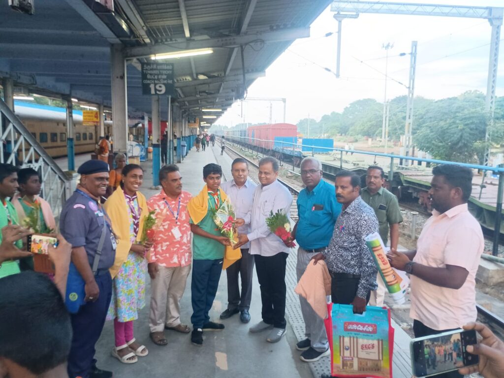 திண்டுக்கல் ரயில் நிலையத்தில் மாணவர்களுக்கு சிறப்பான வரவேற்பு அளிக்கப்பட்டது. பாரத சாரண சாரணிய இயக்கத்தின் சார்பாக உத்தரப்பிரதேச மாநிலம் லக்னோவில் கடந்த 23.11.2025 முதல் 29.11.2025 வரை 7 நாட்கள் 19 -ஆவது தேசிய பெருந்திரளணி நடைபெற்றது.