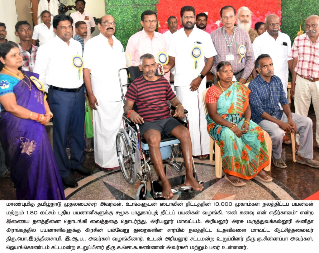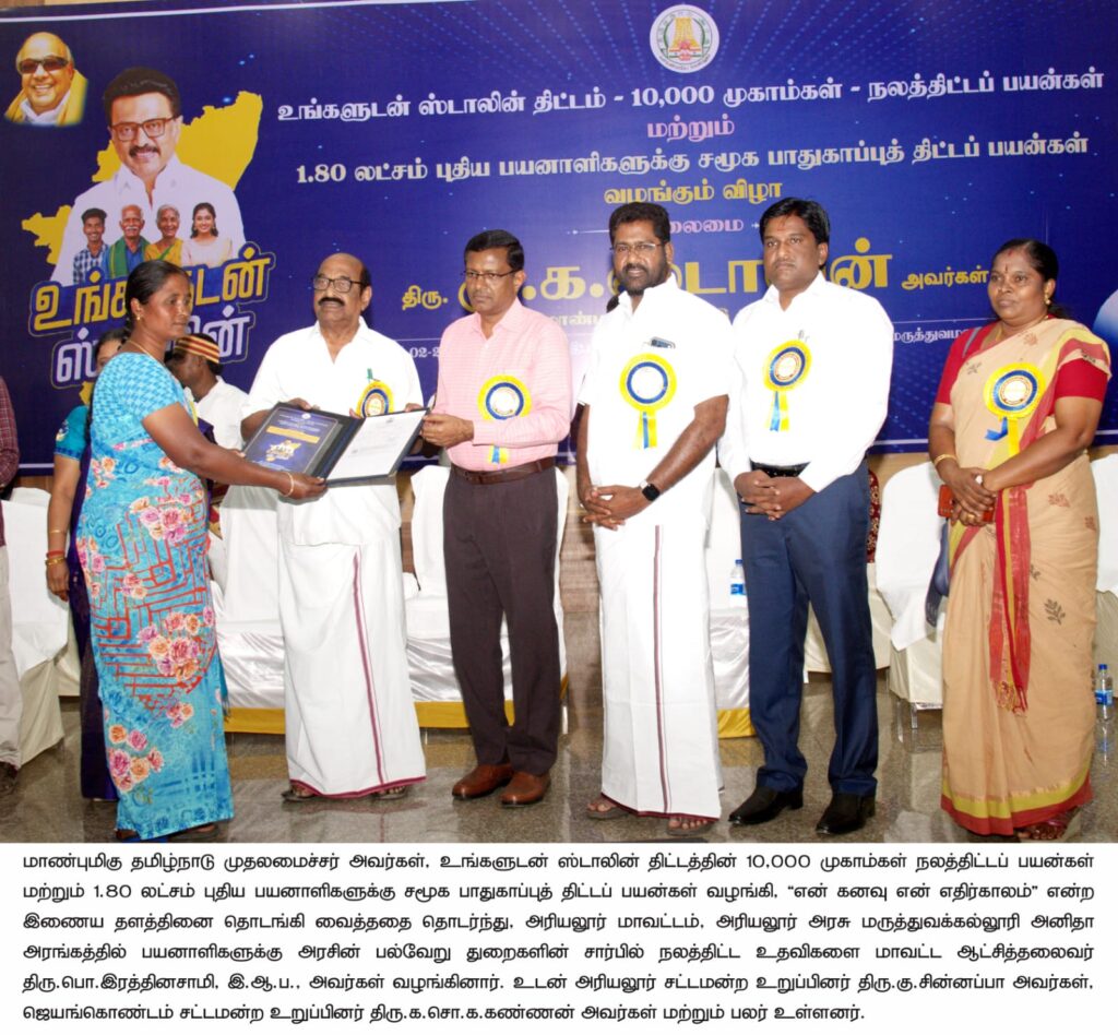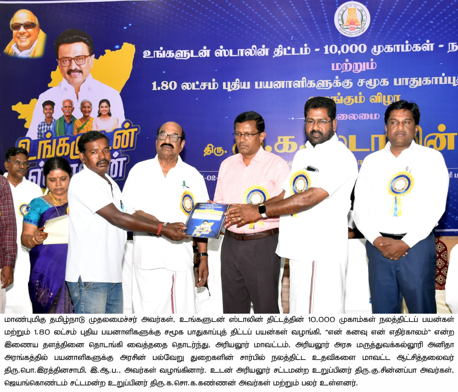 விழுப்புரம் மாவட்டதில் தமிழ்நாடு முதலமைச்சர் உங்களுடன் ஸ்டாலின் திட்டத்தின் கீழ் நலத்திட்டப் பயன்கள் மற்றும் சமூக பாதுகாப்புத் திட்டப்பயன்கள் வழங்கி, “என் கனவு என் எதிர்காலம்” என்ற இணைய தளத்தினை தொடங்கி வைத்தார். அதனை தொடர்ந்து அரியலுார் மாவட்ட கலெக்டர் பொ.இரத்தினசாமி