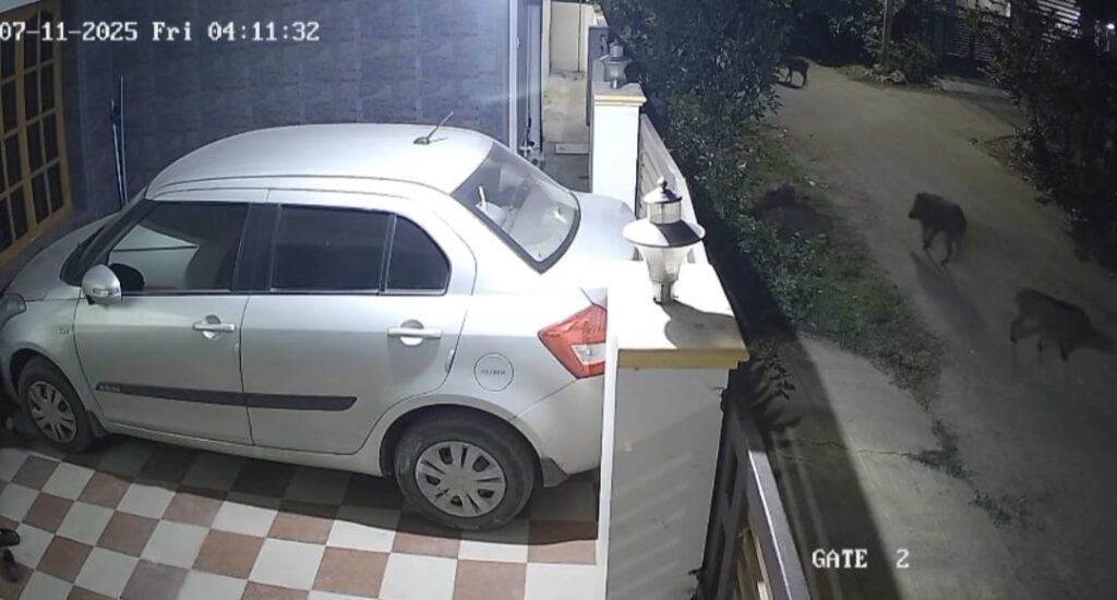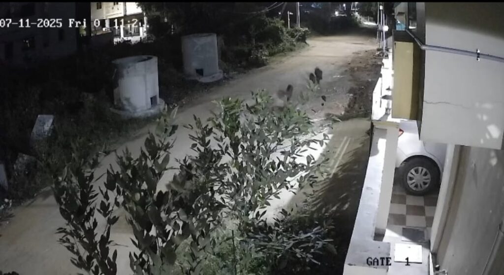 இந்த நிலையில் நேற்று காலை 4 மணி அளவில் 7 க்கும் மேற்பட்ட காட்டுப் பன்றிகள் சாய்நகர் உள்ளிட்ட பகுதிகளில் சர்வசாதாரணமாக வருகின்றன. இந்த காட்சிகள் அங்கு இருந்த வீட்டில் உள்ள சி.சி.டி.வி-யில் பதிவாகி உள்ளது. தற்போது இந்த காட்சிகள் வெளியாகி அந்த பகுதி மக்கள் இடையே பீதியை ஏற்படுத்தி உள்ளது.
