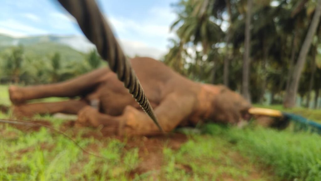 இதனைத் தொடர்ந்து நேற்று இரவு கோவை தொண்டாமுத்தூர் அருகே உள்ள குப்பேபாளையம் விவசாயி நாகராஜ் என்பவர் தோட்டம் உள்ள பகுதிக்கு உணவு தேடி வந்த 25 வயது மதிக்கத்தக்க ஆண் காட்டு யானை ஒன்று அங்கு இருந்த மின் கம்பியை சாய்த்து உள்ளது. சாய்ந்து அந்த மீது மின் கம்பம் யானையின் மீது விழுந்து மின்சாரம் தாக்கி சம்பவ இடத்திலேயே பரிதாபமாக உயிரிழந்து உள்ளது. தகவல் அறிந்த அங்கு வந்த வனத் துறையினர் சம்பவ இடத்தில் யானை உயிரிழந்தது தொடர்பாக விசாரணை நடத்தி வருகின்றன. மேலும் வனத்துறை கால்நடை மருத்துவர்கள் உடற்கூறு ஆய்வு செய்வதற்கு தகவல் அளித்து உள்ளனர்.