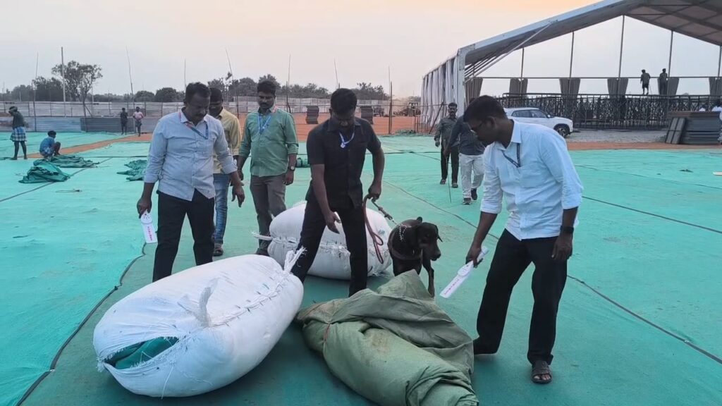 மதுரை மண்டையில் நகர் பகுதியில் பிரதமர் பங்கேற்கும் தேசிய ஜனநாயக பொதுக்கூட்டத்தில் ஏற்பாடு பணிகள் தீவிரமாக நடைபெற்று வருகிறது தமிழக காவல்துறை சார்பாக வெடிகுண்டு தடுப்பு பிரிவினர் ஐந்து மாவட்ட குழுவினரை வரவழைக்கப்பட்டு மோப்பநாய் கொண்டு தீவிர சோதனை மேற்கொண்டு வருகின்றனர்.