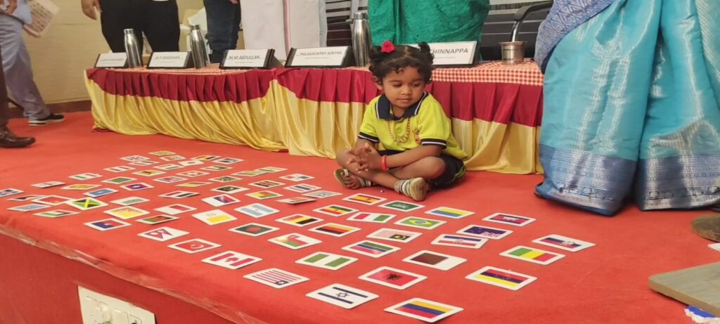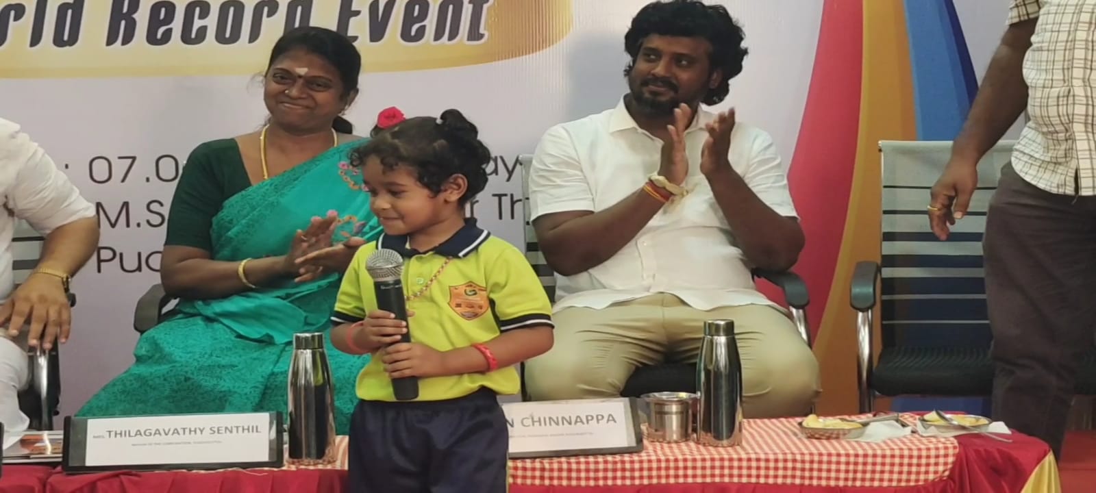 புதுக்கோட்டை திலகர் திடலில் குருகுலம் தனியார் நர்சரி பள்ளி எல்கேஜி மாணவி யாழிசை வெண்பா 123 நாடுகளின் பெயரை கொடிகளை அடையாளம் கண்டு வரிசையாக ஒப்புவித்தார்.
