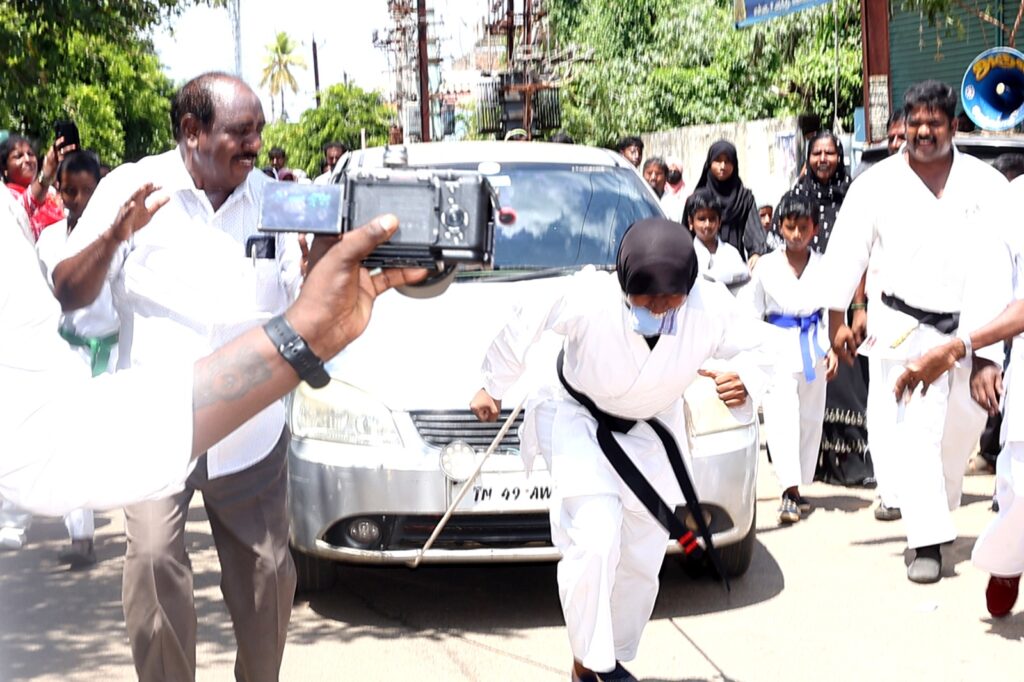 தஞ்சாவூர் மாவட்டம் ஒரத்தநாட்டில் நேற்று தனியார் கராத்தே நிறுவனம் நடத்திய பிளாக் பெல்ட் வழங்கும் நிகழ்ச்சியில் ஒரத்தநாடு முஸ்லிம் தெருவை சேர்ந்த முகமது ஆசிப் சகுபநிஷத் இவர்களின் மகள் ஆஷிபா 22 என்பவர் பல்லால் காரை கட்டி எடுத்து சாதனை படைத்தார்.
