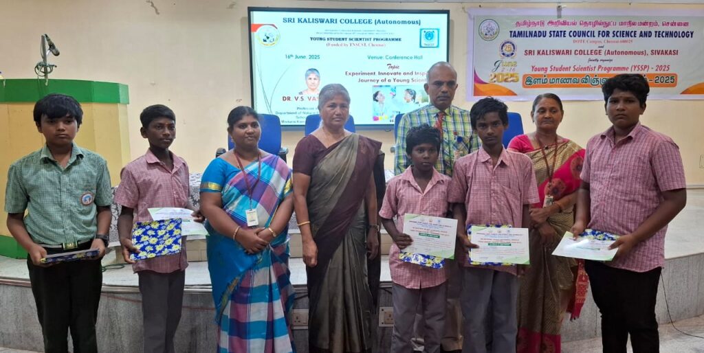 தமிழ்நாடு தொழில்நுட்ப மாநில மன்றத்தின் சார்பாக விருதுநகர் மற்றும் ராமநாதபுரம் மாவட்டத்தில் இருந்து அரசு மற்றும் அரசு உதவி பெறும் பள்ளிகளை சேர்ந்த ஒன்பதாம் வகுப்பு பயிலும் மாணவ, மாணவியர்களுக்கான இளம் மாணவ விஞ்ஞானி திட்டம் 2025 கடந்த 2ஆம் தேதி தொடங்கி 16ஆம் தேதி வரை நடைபெற்றது. நிகழ்விற்கான நிறைவு விழா விருதுநகர் மாவட்டம் சிவகாசி ஸ்ரீ காளீஸ்வரி கல்லூரி வளாகத்தில் நடைபெற்றது.
